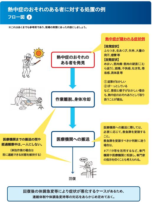 熱中症のおそれがある従業員が発生した際に迅速かつ適切に対応できるよう、どのように行動すべきかを具体的に示した手順書を作成します。以下の例のようなフロー図があると望ましいです。